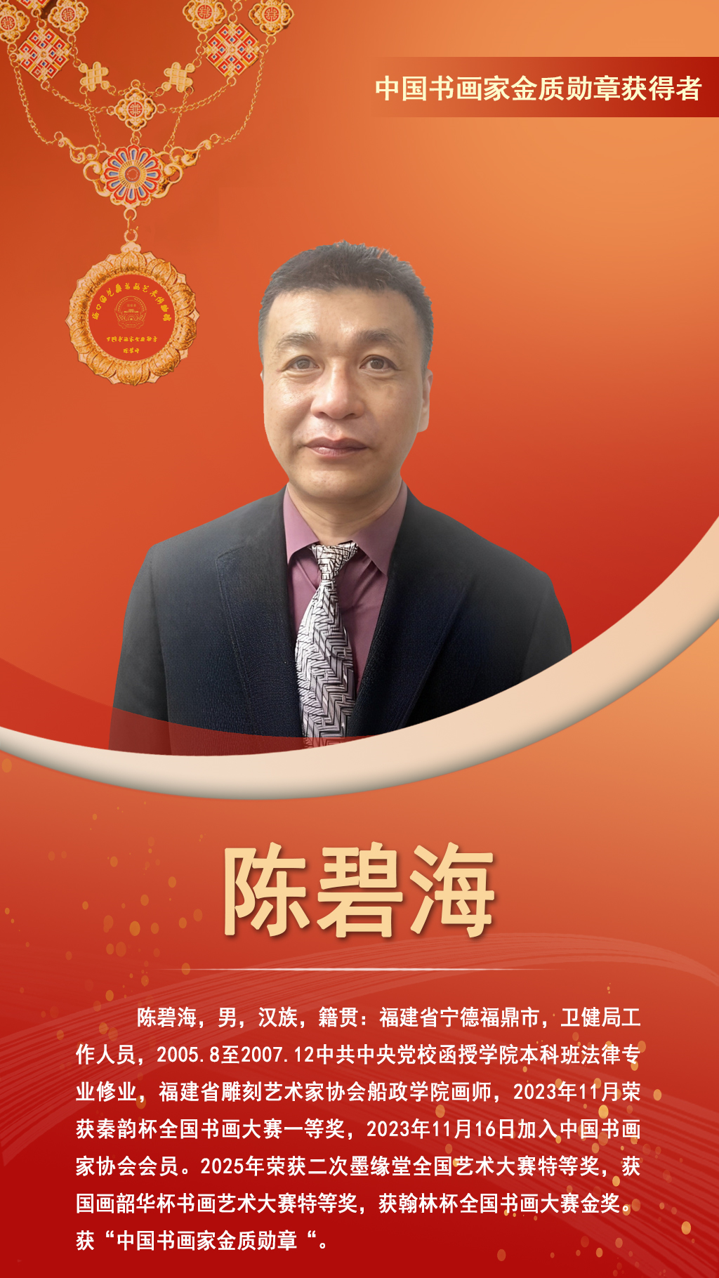 陈碧海,男,汉族,籍贯:福建省宁德福鼎市,卫健局工作人员,2005.8至2007.12中共中央党校函授学院本科班法律专业修业,2018年1月加入福鼎市书法协会同年加入美术协会,2019年12月聘为福建省雕刻艺术家协会船政学院画师,2023年11月荣获秦韵杯全国书画大赛一等奖,2023年11月16日加入中国书画家协会会员。 2025年荣获二次墨缘堂全国艺术大赛特等奖,又获一次翰墨杯金奖,又获一次国画韶华杯书画艺术大赛特等奖,又获翰林杯全国书画大赛金奖。2025年经国艺委书画艺术博物馆常务会议审议通过,决定授予“中国书画家金质勋章“。