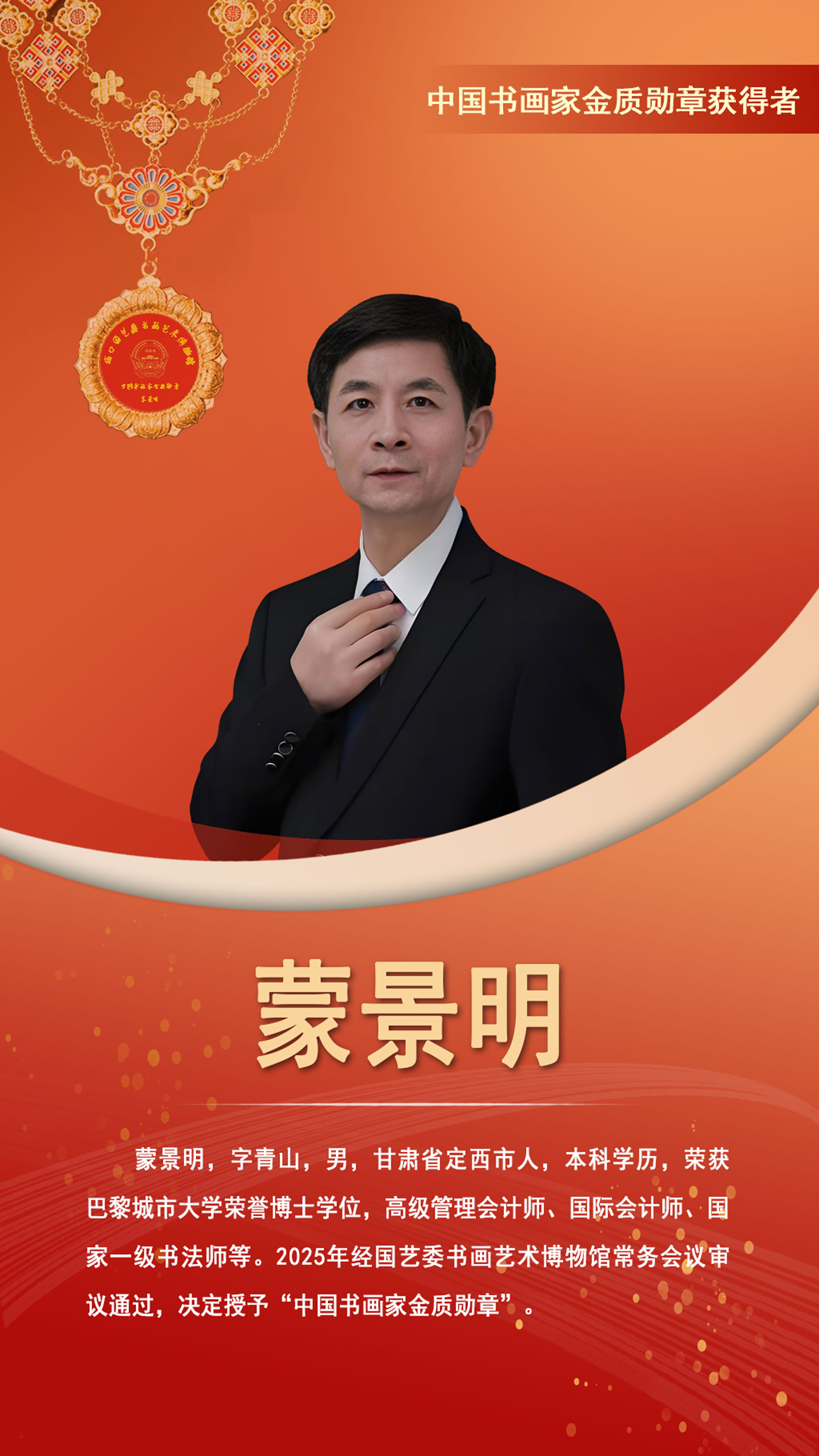 关于授予蒙景明“中国书画家金质勋章”荣誉的决定发表时间:2025-06-30 15:18 关于授予蒙景明“中国书画家金质勋章”荣誉的决定